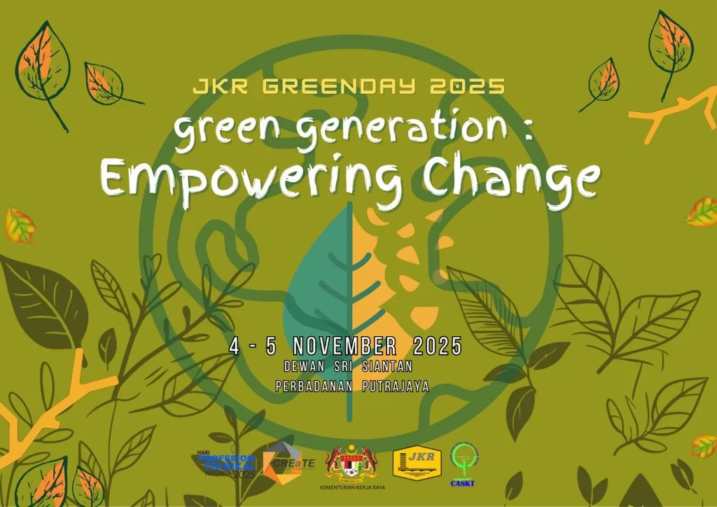 JKR Greenday merupakan satu program dwi tahunan dengan kerjasama Pusat Kecemerlangan Kejuruteraan dan Teknologi (CREaTE) dan Cawangan Alam Sekitar dan Kecekapan Tenaga (CASKT), JKR Malaysia. JKR GreenDay 2025 bertemakan The Green Generation: Empowering Change, program ini akan menjadi platform yang bertujuan memberikan pendedahan dan kefahaman tentang aspek kelestarian dan teknologi hijau secara amnya dan berfokus kepada industri pembinaan negara secara khususnya. Aspek Kelestarian dalam industri pembinaan merangkumi semua bidang seperti Senibina, Kejuruteraan Awam, Mekanikal, Elektrikal, Ukur Tanah dan Ukur Bahan. JKR GreenDay 2025 akan membawa 8 pembentang dan moderator yang terlibat secara langsung dalam bidang -bidang berkenaan bagi berkongsi ilmu pengetahuan dan pengalaman berkenaan isu-isu serta cabaran semasa seterusnya teknologi dan penyelesaian mampan terkini. Risalah program dan atur cara dapat di akses melalui pautan JKR GreenDay website seperti berikut;